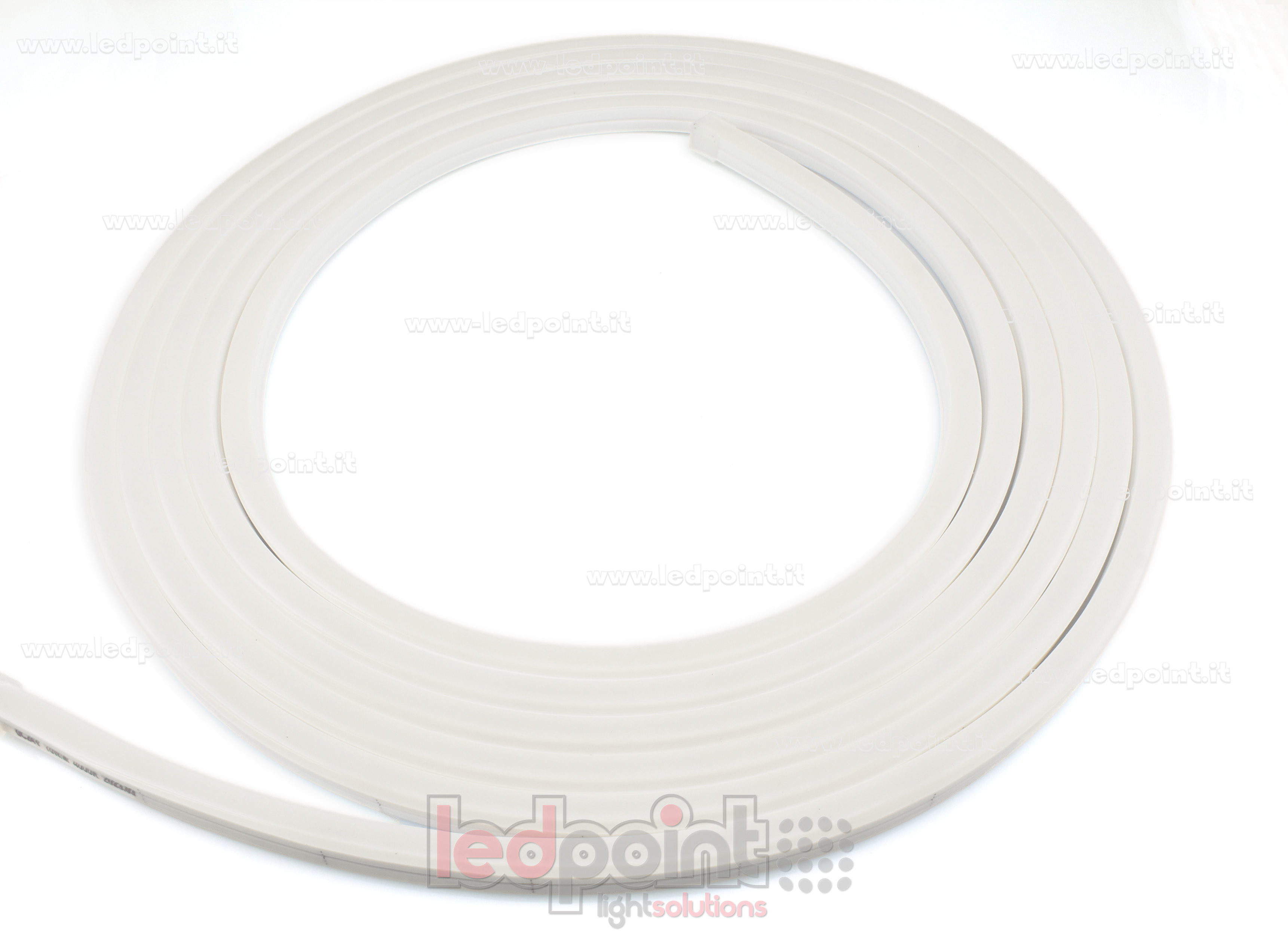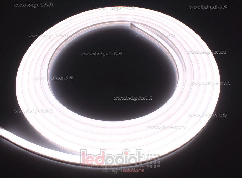 Tube LED flexible en matériel en silicone extrudé avec ruban 4000K. Nos neon flex sont fabriqués entièrement en polyuréthane, un revêtement spécial étanche (IP67) conçu pour les applications intensives. Il est très durable, il n'a pas tendance à se fissurer ou a se détériorer et sa couleur ne s'altère pas avec le temps car il est en mesure de résister aux rayons UV, à l'eau salée et aux solvants. C'est un matériau robuste et extrêmement flexible qui garantit une grande fiabilité au fil du temps.