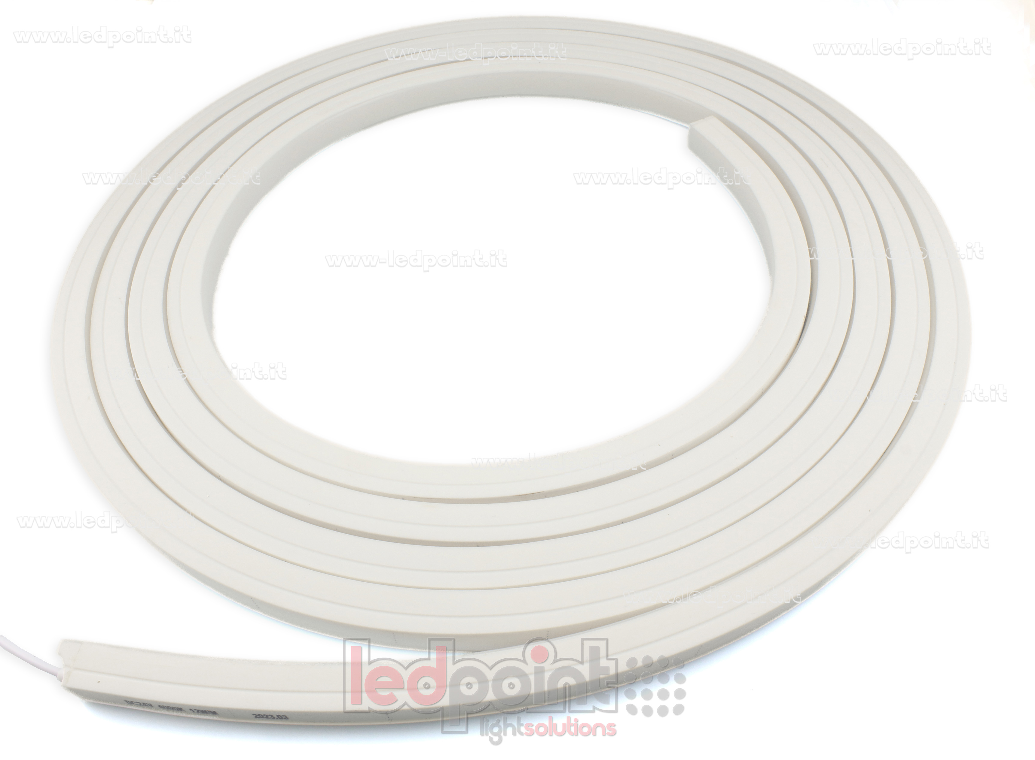 Tube LED flexible en matériel en silicone extrudé avec ruban 4000K. Nos neon flex sont fabriqués entièrement en polyuréthane, un revêtement spécial étanche (IP67) conçu pour les applications intensives. Il est très durable, il n'a pas tendance à se fissurer ou a se détériorer et sa couleur ne s'altère pas avec le temps car il est en mesure de résister aux rayons UV, à l'eau salée et aux solvants. C'est un matériau robuste et extrêmement flexible qui garantit une grande fiabilité au fil du temps.