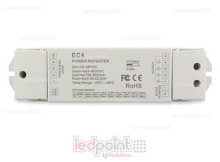 Amplificateur de signal courant constant, 24-48V, avec 4 canaux de 150-500mA. Utilisable pour rubans led à tension constant, monocouleur, CCT, RGB e RGBW.