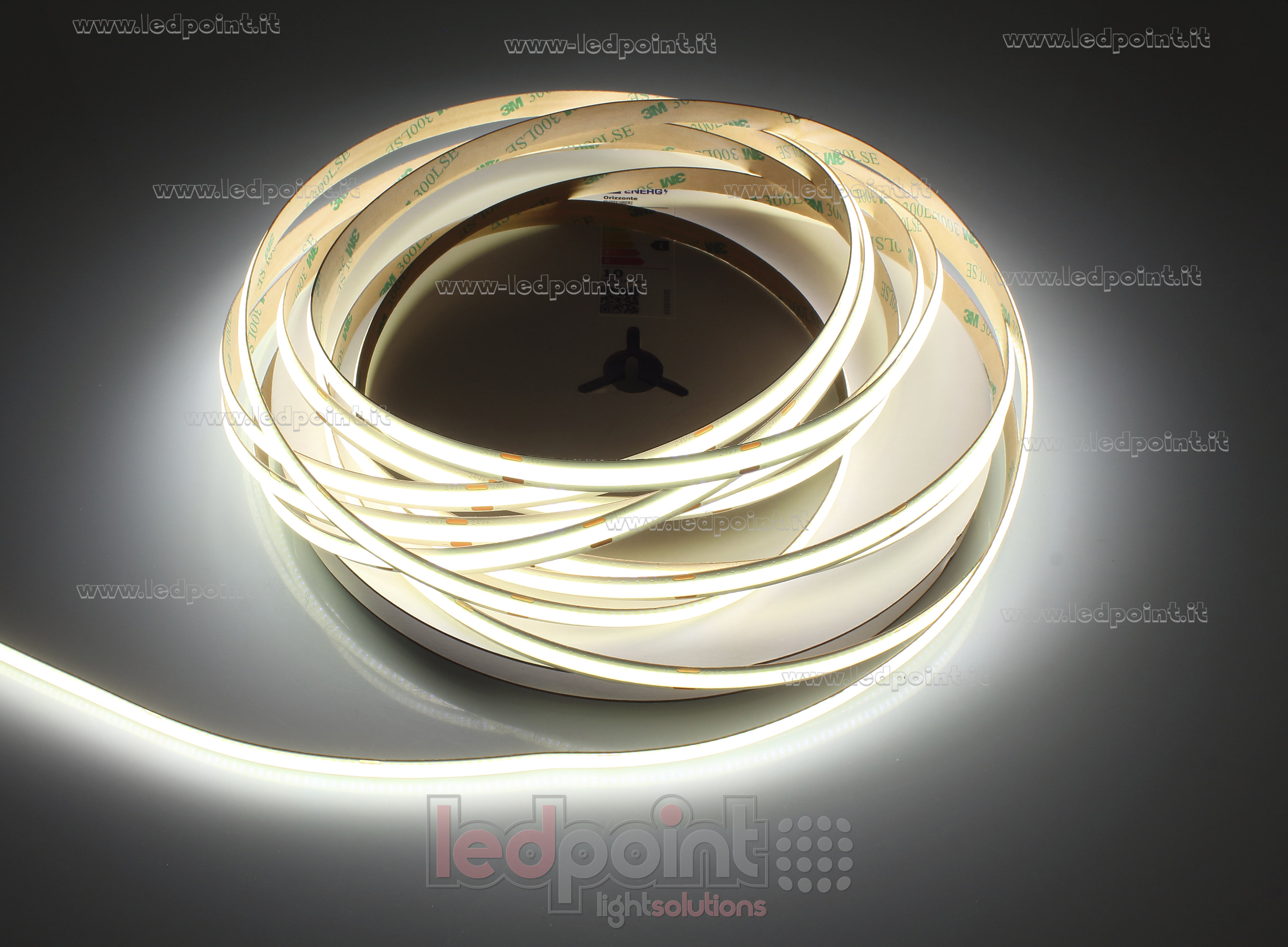 Ruban led flexible doté à l'arrière d'un adhésif pour une installation rapide aussi sur les surfaces courbes. Grâce au revêtement posé sur les LED, le ruban COB permet de créer des lignes de lumière sans effet pointillé avec un angle de diffusion.