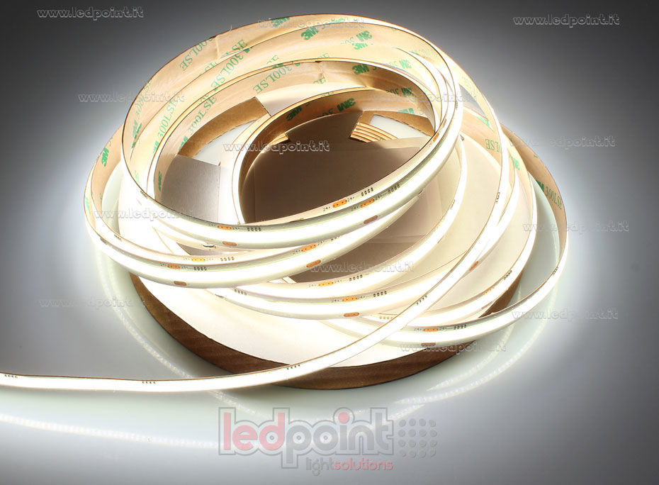 Ruban led flexible doté à l'arrière d'un adhésif pour une installation rapide aussi sur les surfaces courbes. Grâce au revêtement posé sur les LED, le ruban COB permet de créer des lignes de lumière sans effet pointillé avec un angle de diffusion.