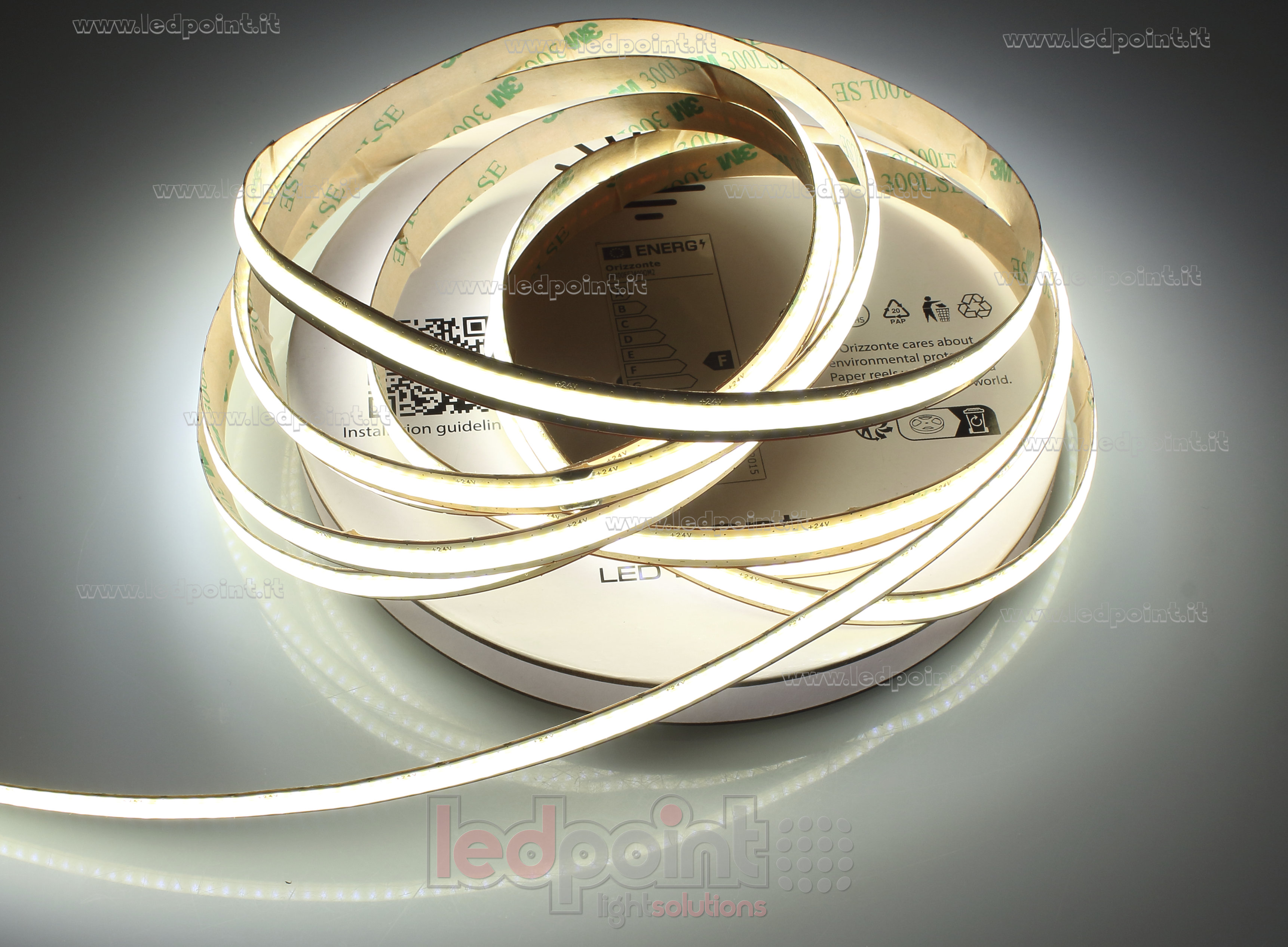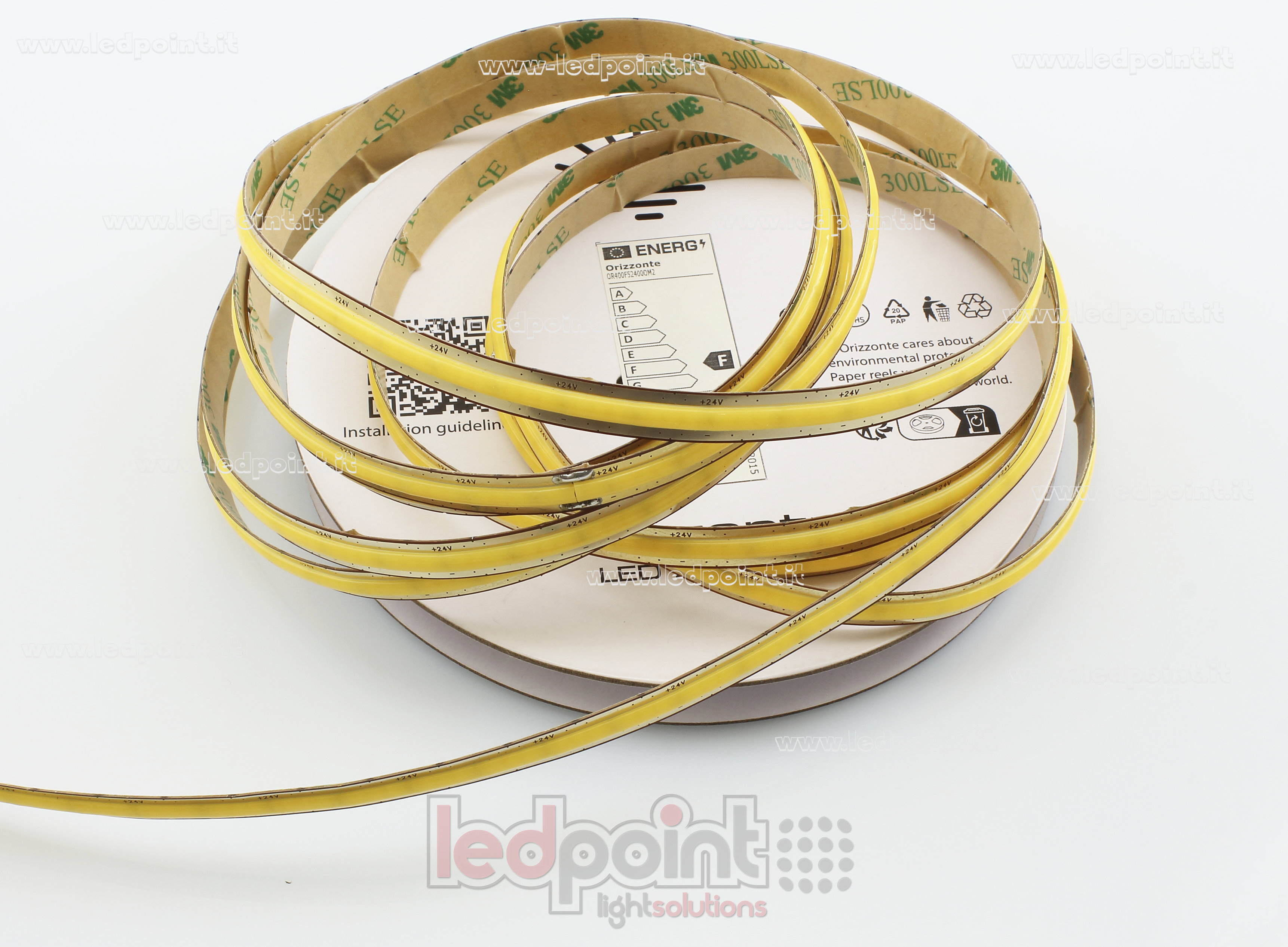 Ruban led flexible doté à l'arrière d'un adhésif pour une installation rapide aussi sur les surfaces courbes. Grâce au revêtement posé sur les LED, le ruban COB permet de créer des lignes de lumière sans effet pointillé avec un angle de diffusion.