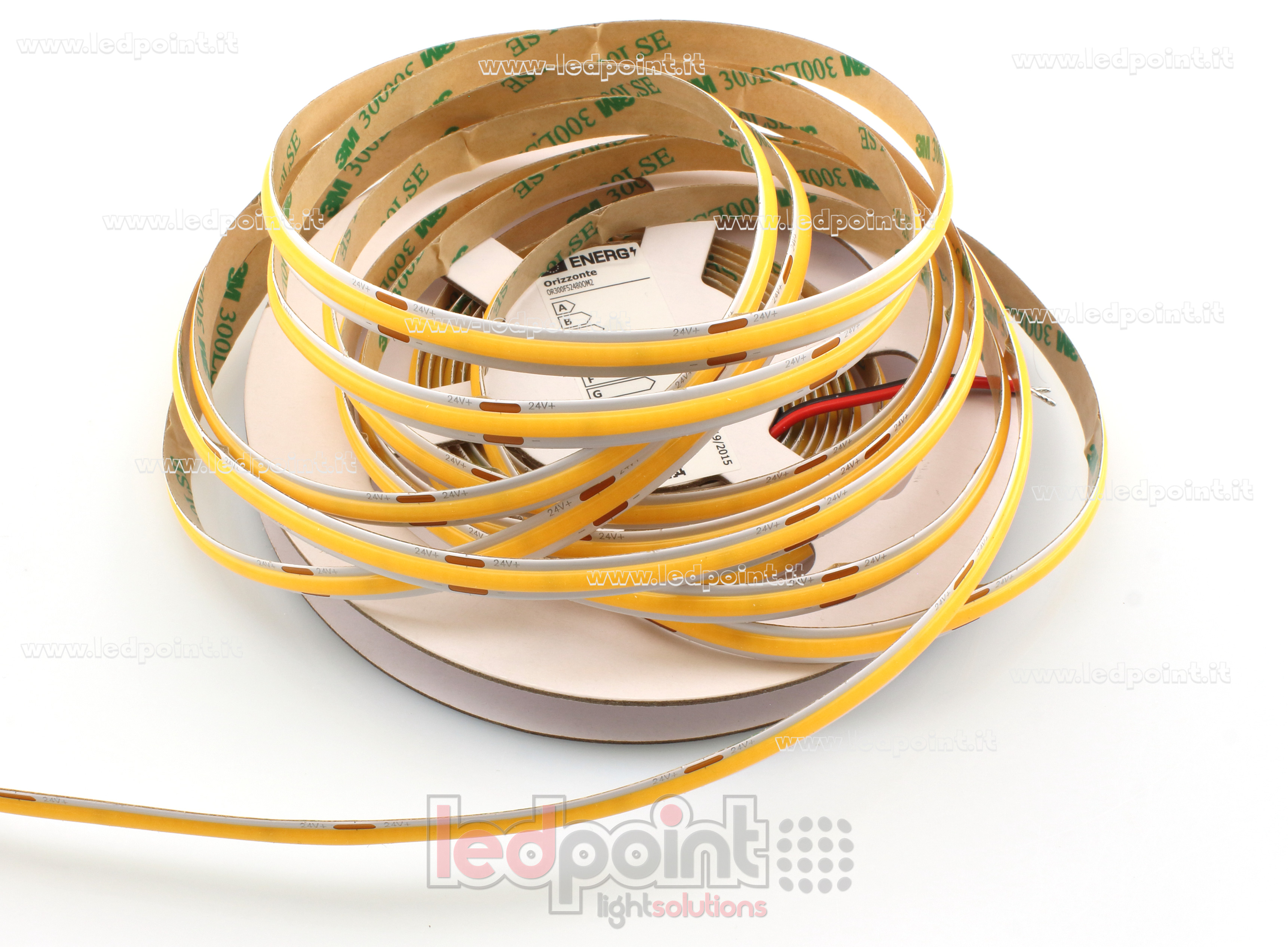 Ruban led flexible doté à l'arrière d'un adhésif pour une installation rapide aussi sur les surfaces courbes. Grâce au revêtement posé sur les LED, le ruban COB permet de créer des lignes de lumière sans effet pointillé avec un angle de diffusion.