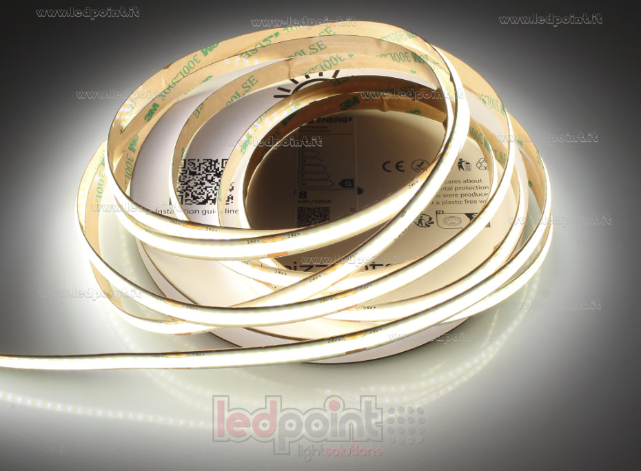 Ruban led flexible doté à l'arrière d'un adhésif pour une installation rapide aussi sur les surfaces courbes. Grâce au revêtement posé sur les LED, le ruban COB permet de créer des lignes de lumière sans effet pointillé avec un angle de diffusion.