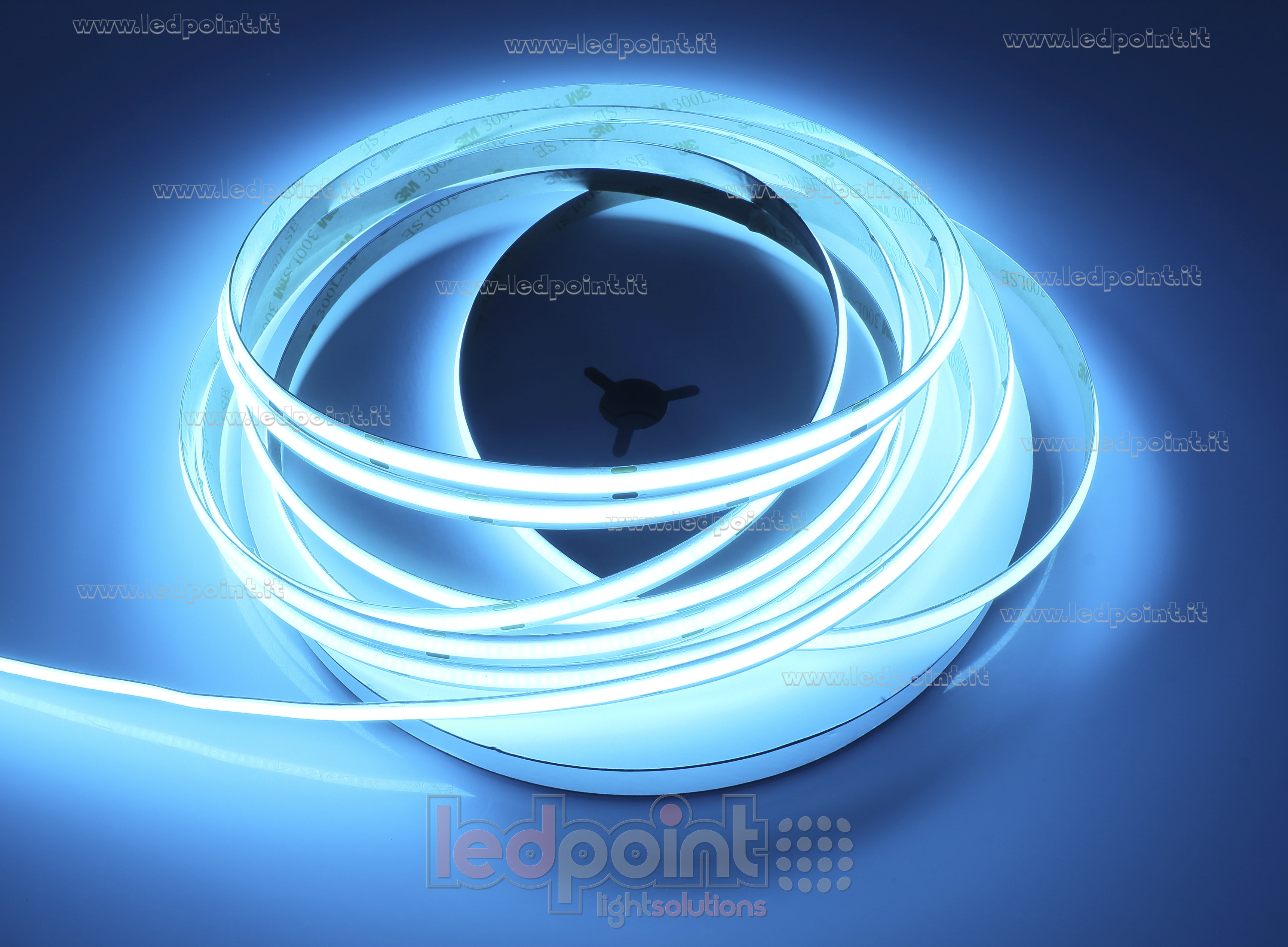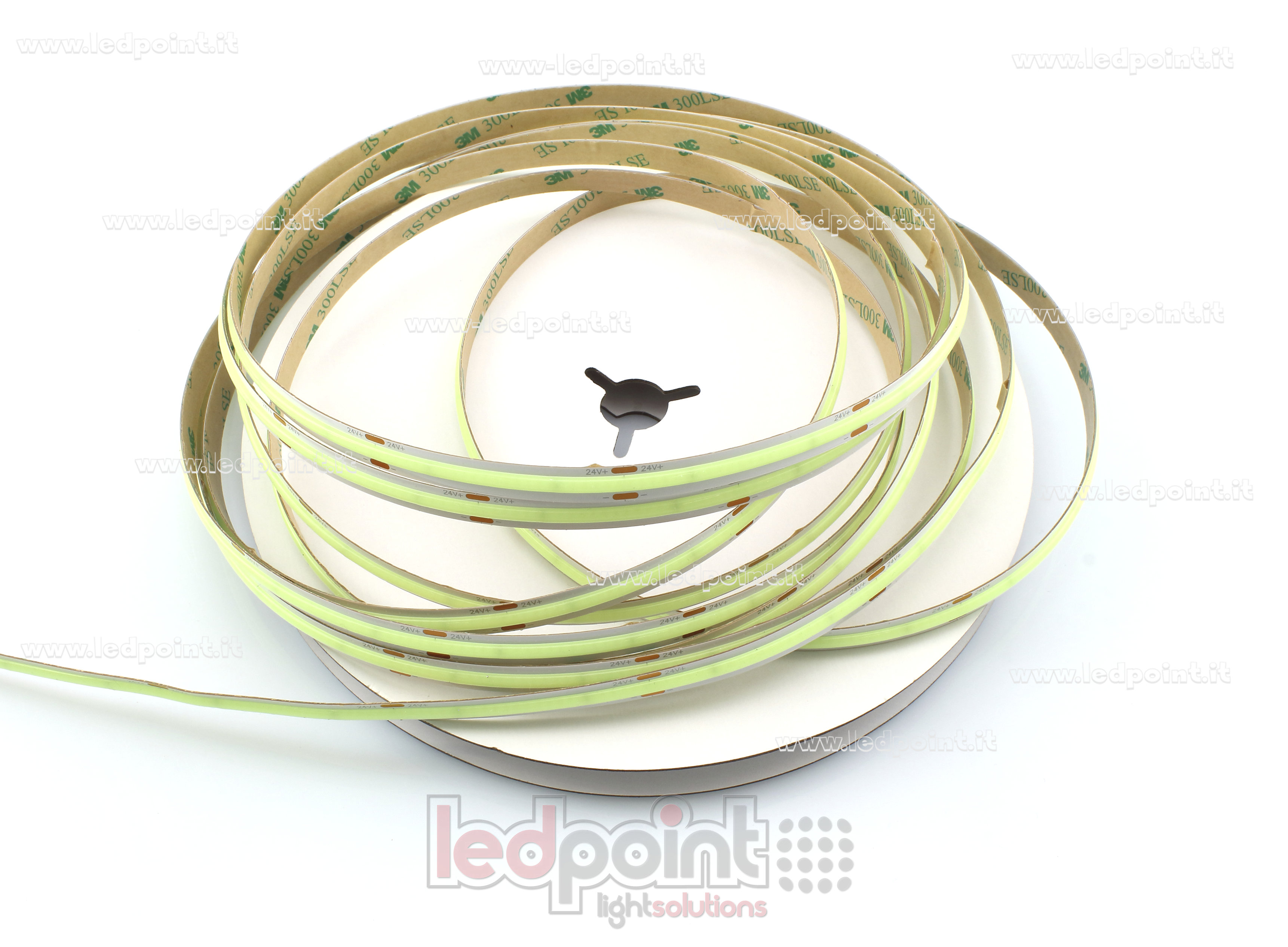 Ruban led flexible doté à l'arrière d'un adhésif pour une installation rapide aussi sur les surfaces courbes. Grâce au revêtement posé sur les LED, le ruban COB permet de créer des lignes de lumière sans effet pointillé avec un angle de diffusion.