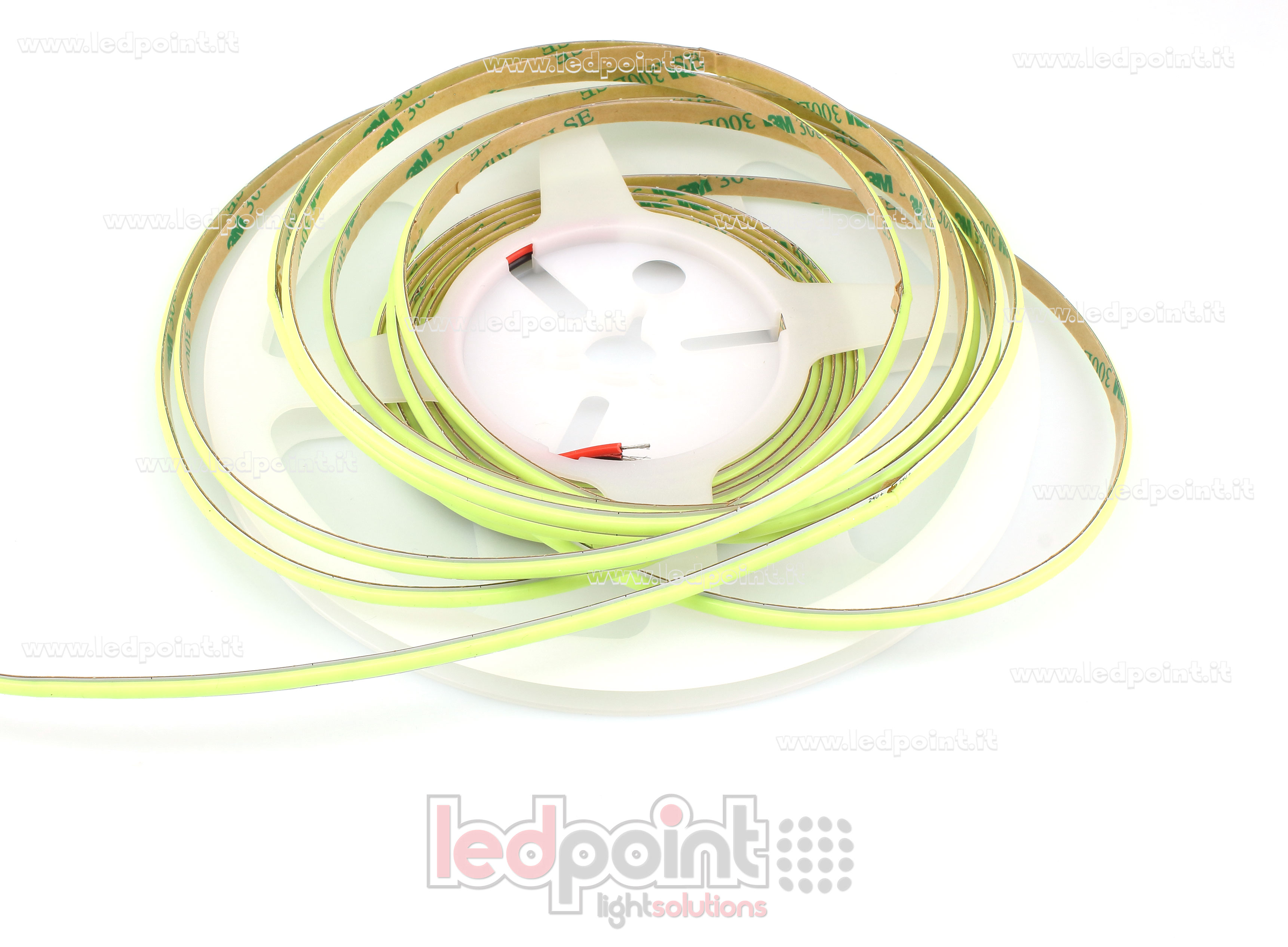 Ruban led flexible doté à l'arrière d'un adhésif pour une installation rapide aussi sur les surfaces courbes. Grâce au revêtement posé sur les LED, le ruban COB permet de créer des lignes de lumière sans effet pointillé avec un angle de diffusion.