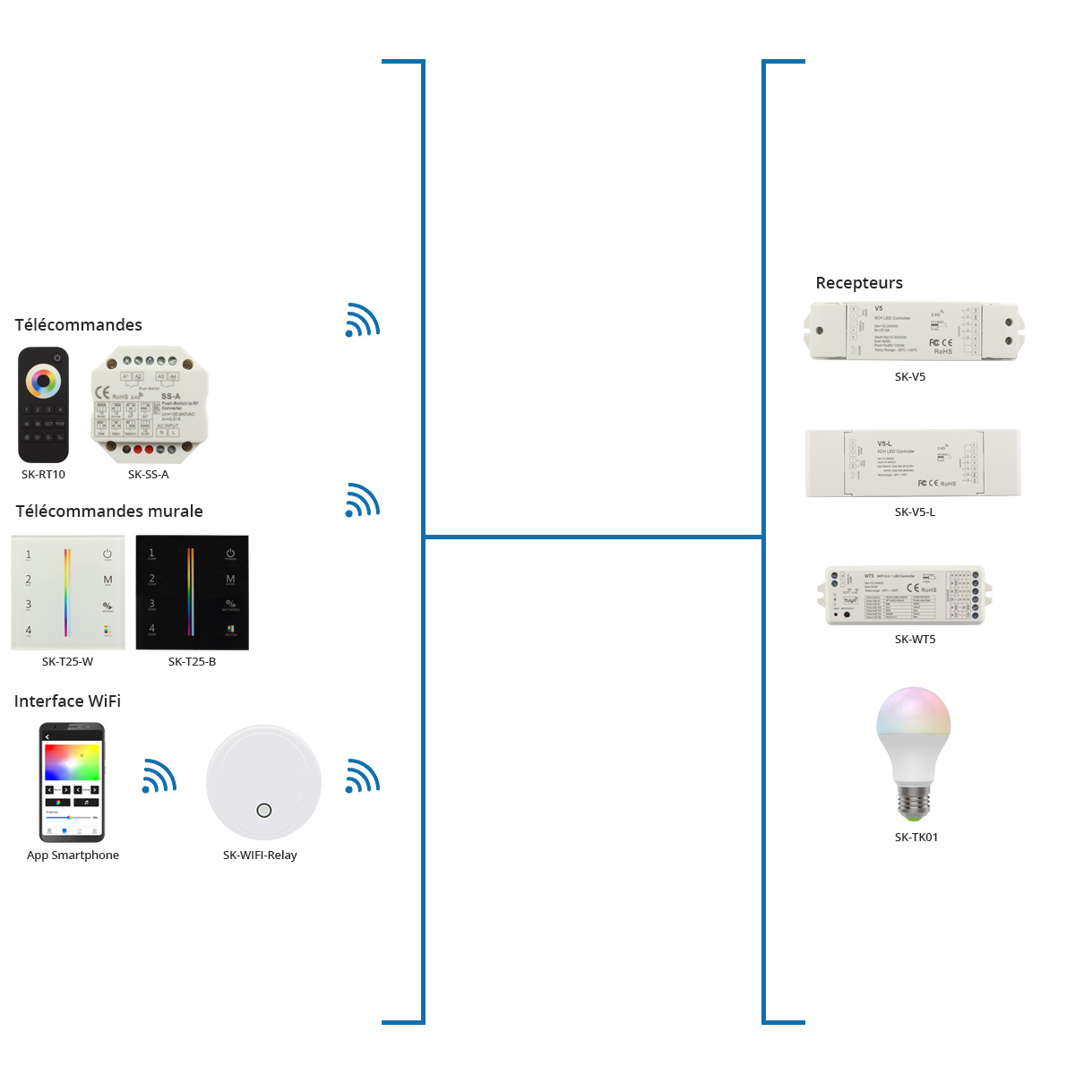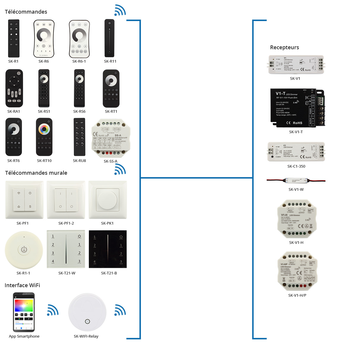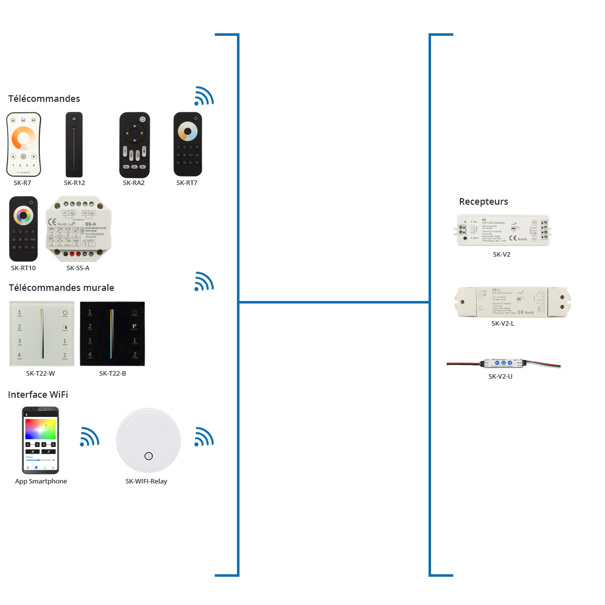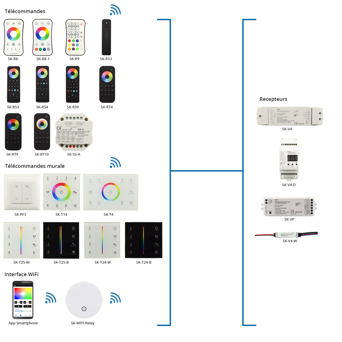 La large gamme de produits Skydance vous permet de créer votre kit et de connecter plusieurs appareils pour le contrôle de votre système d’éclairage. Choisissez votre système de contrôle pour votre ruban LED monocouleur, RGB, RGBW, CCT et RGB+CCT.