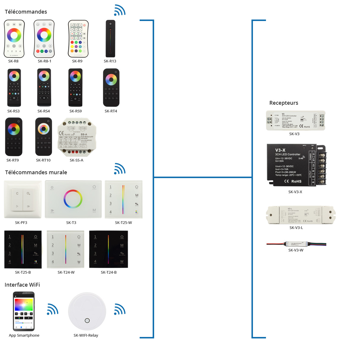 Le système de contrôle RGB comprend récepteurs 3 canaux, télecommandes manuelles ou murales, appareils Wifi et amplificateurs de signal. Tous les récepteurs 3 canaux peuvent être utilisés pour contrôler rubans LED RGB, CCT et monocouleur et peuvent être associés à 10 télécommandes. Chaque récepteur peut transmettre le signal à un autre récepteur dans un rayon de 100 m