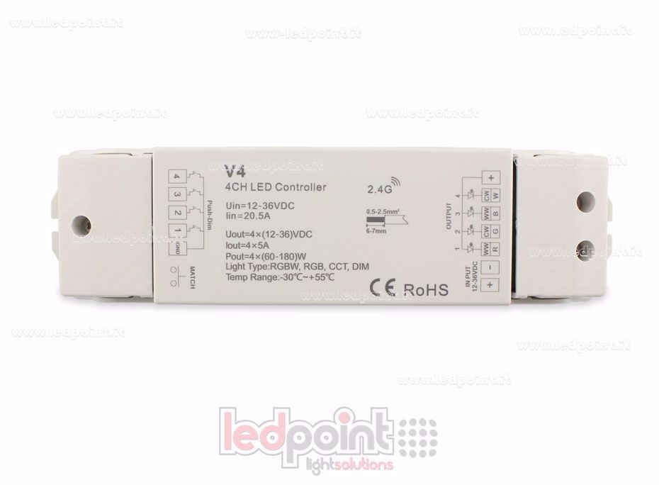 SYSTÈMES SKYDANCE CATALOGUE FAQ Récepteur variateur RF LED 4 canaux RGB, RGBW, CCT et monochromatique, associable aux télécommandes RF monochromatiques, CCT, RGB e RGBW. Un contrôleur peut etre associé jusqu'à 10 télécommandes. On peut connectre 4 interrupteurs externes pour avoir la fonction on/off et dimmer sur chaque canal. En réglant la lumière en CCT, RGB ou RGBW, il permet de configurer les interrupteurs pour régler toute type de ruban.
